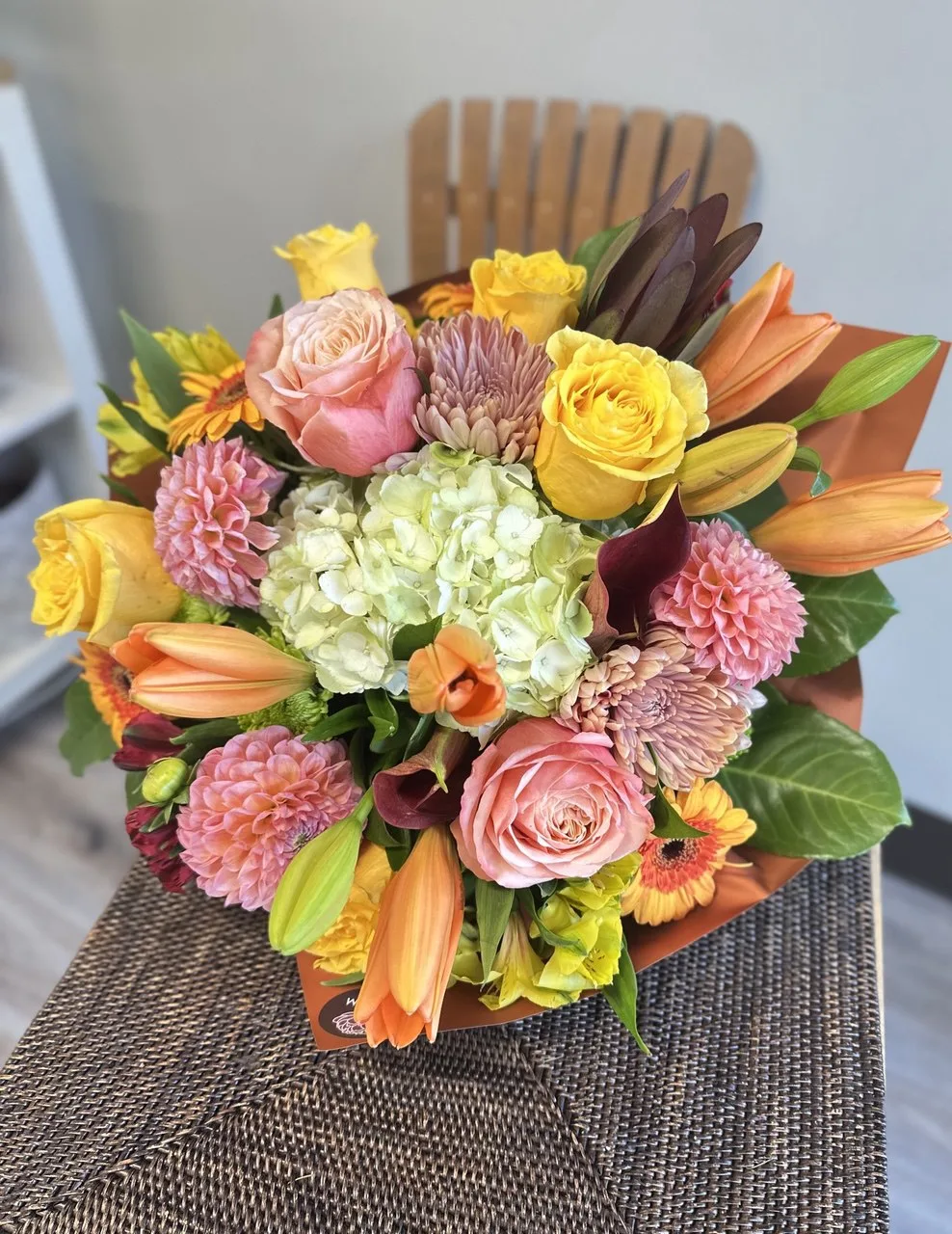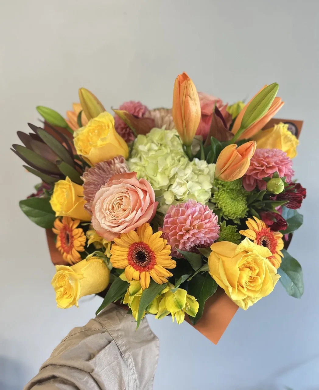 Aurora Dream is a radiant bouquet that captures the magic of a sunrise in full bloom, blending golden yellow roses, fiery orange lilies, soft blush dahlias, and cheerful gerberas around a lush heart of hydrangea. Designed to embody warmth, joy, and renewal, this vibrant arrangement is perfect for celebrating life’s brightest moments—from birthdays and anniversaries to heartfelt “just because” surprises. With its harmonious mix of colors and textures, Aurora Dream feels like holding a piece of dawn itself, bringing light and beauty into any space.