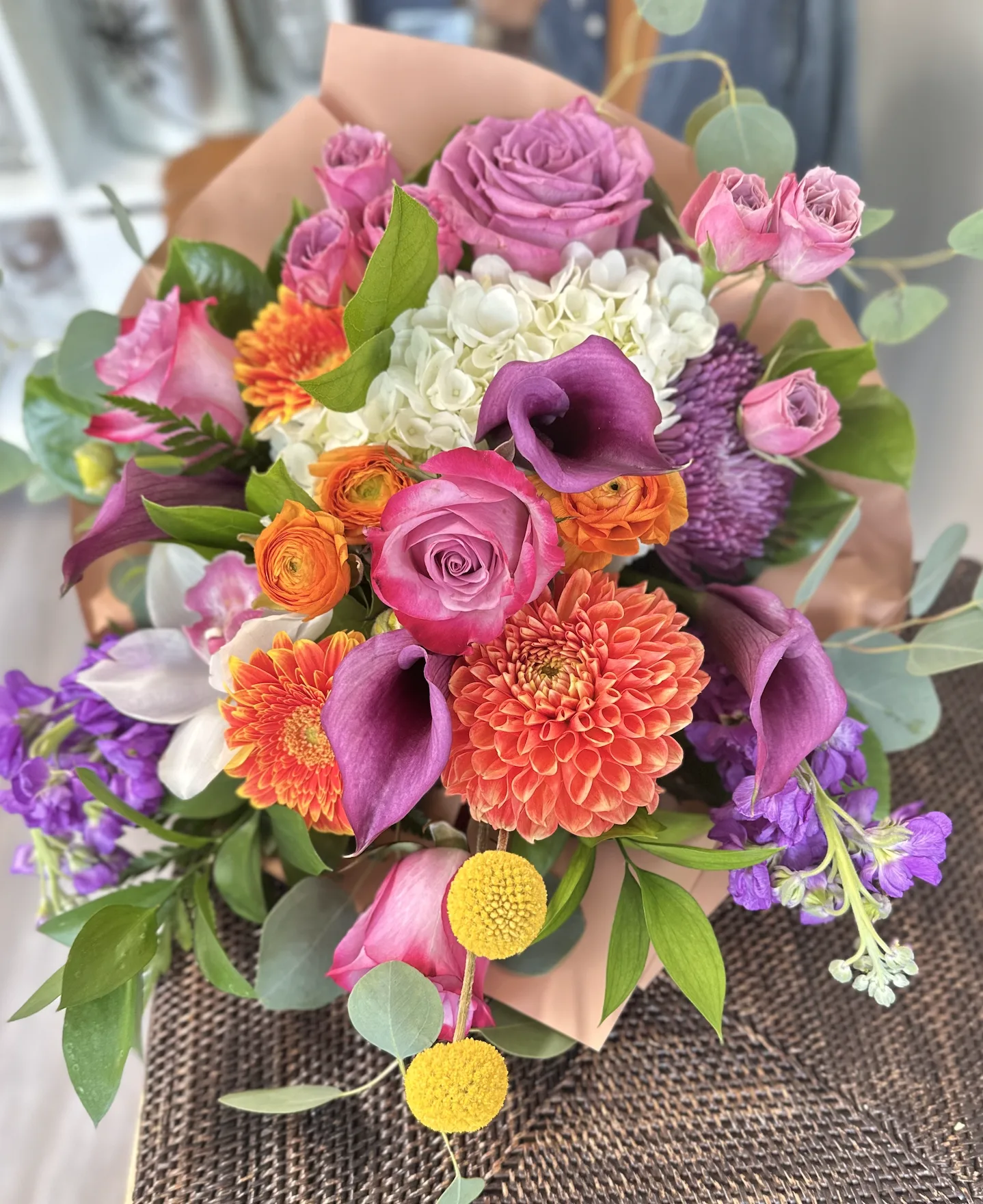 Chroma Blossom is a dazzling explosion of color and texture, designed to showcase the artistry of nature in full spectrum. Featuring rich purple calla lilies, lavender and blush roses, radiant dahlias, fiery ranunculus, exotic cymbidium orchids, playful craspedia, lush hydrangea, and fragrant stock, this bouquet is a true celebration of vibrancy and elegance. Accented with fresh eucalyptus, it balances bold jewel tones with soft pastels, making it an unforgettable choice for birthdays, anniversaries, or any moment that deserves something extraordinary. Chroma Blossom isn’t just a floral arrangement—it’s a living masterpiece of color harmony.