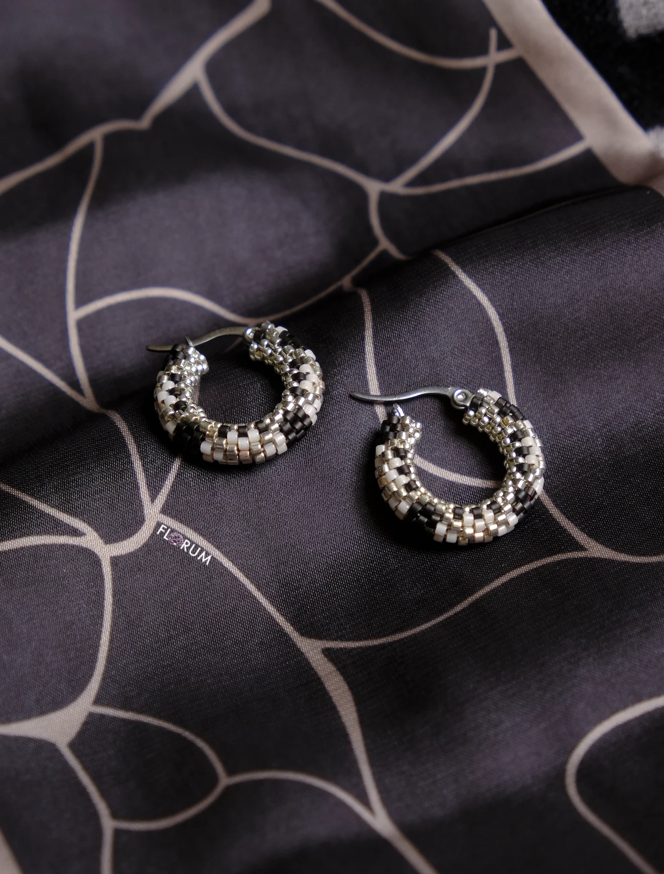 Cream and Brown Silver Beaded Hoop Earrings