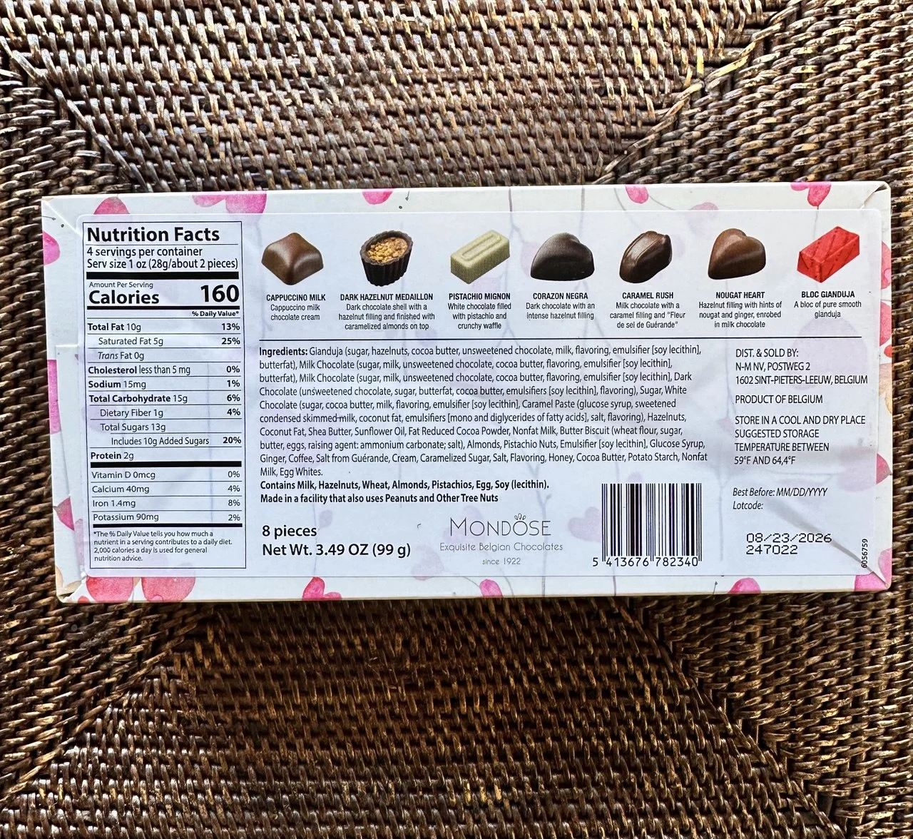 Mondose Exquisite Belgian Chocolates are crafted with quality ingredients, including cocoa butter, milk, sugar, and select nuts, to deliver an indulgent European chocolate taste in every bite. With approximately 160 calories per 2‑piece serving, this 8‑piece chocolate assortment is perfect for sharing after dinner, pairing with coffee, or enjoying as a special dessert