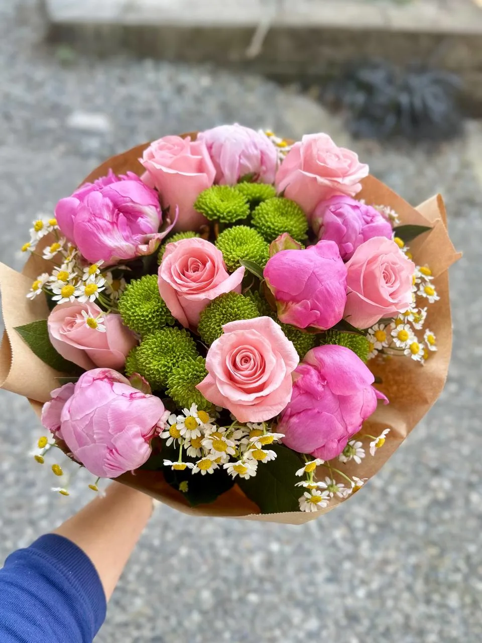 Peony Daydream is a radiant embrace of soft pink peonies, blushing roses, cheerful chamomile, and vibrant green button mums—crafted to evoke the serenity of a spring morning dreamt in full bloom. This hand-tied bouquet blends classic romance with a playful wildflower touch, making it ideal for birthdays, heartfelt gestures, or simply brightening a space with natural charm. Designed for those who adore elegance with a whimsical twist, Peony Daydream brings a gentle burst of color and fragrance that feels both fresh and timeless.