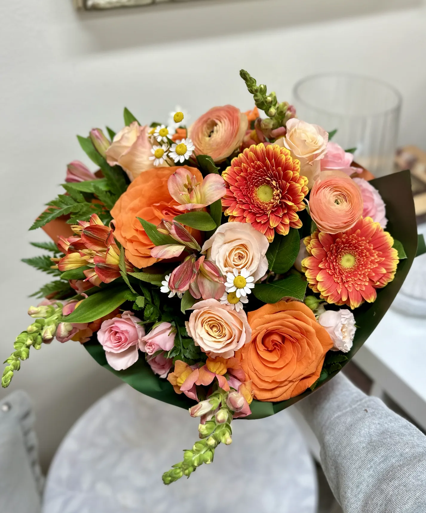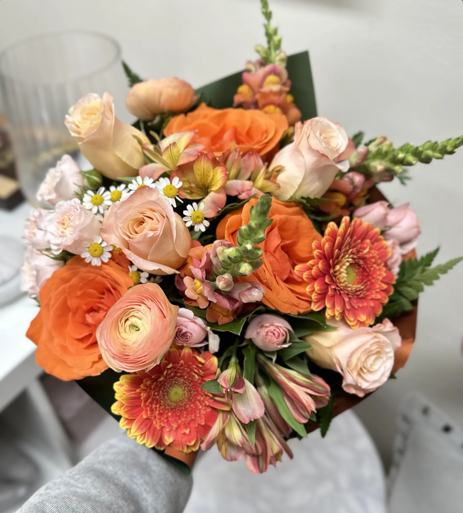 Capture the essence of autumn with Pumpkin Spice Petals, a bouquet that brings the cozy warmth of the season into every room. Featuring vibrant orange roses, lush peach ranunculus, rusty-hued gerbera daisies, delicate spray roses, and soft pink alstroemeria, this arrangement is a celebration of fall's richest colors. Accented with charming chamomile daisies and fresh green foliage, this bouquet evokes the magic of pumpkin spice and everything nice. Perfect for adding a touch of seasonal charm to any occasion, Pumpkin Spice Petals is a stunning reminder of autumn's beauty and warmth. Order now to bring this cozy fall bouquet into your home or gift it to someone special.