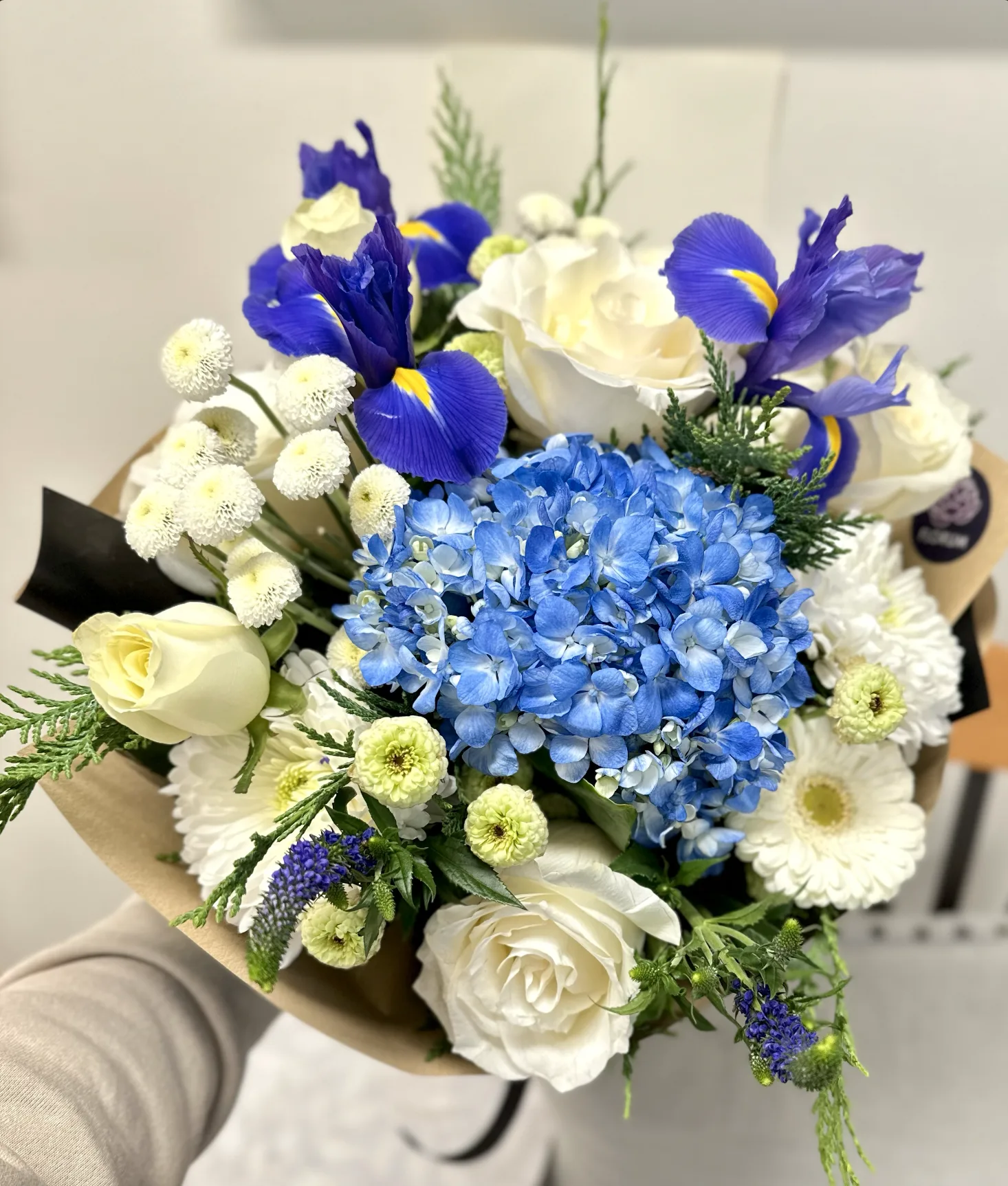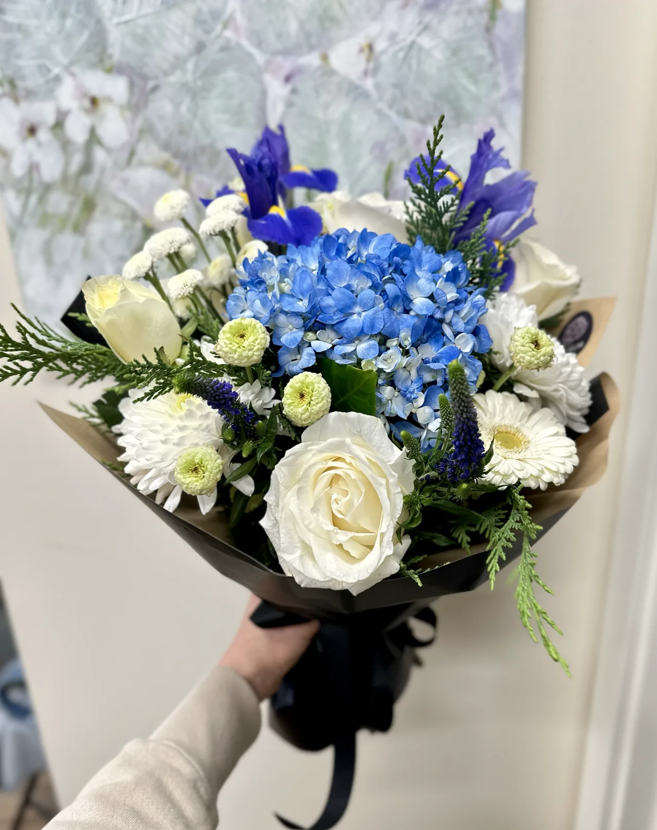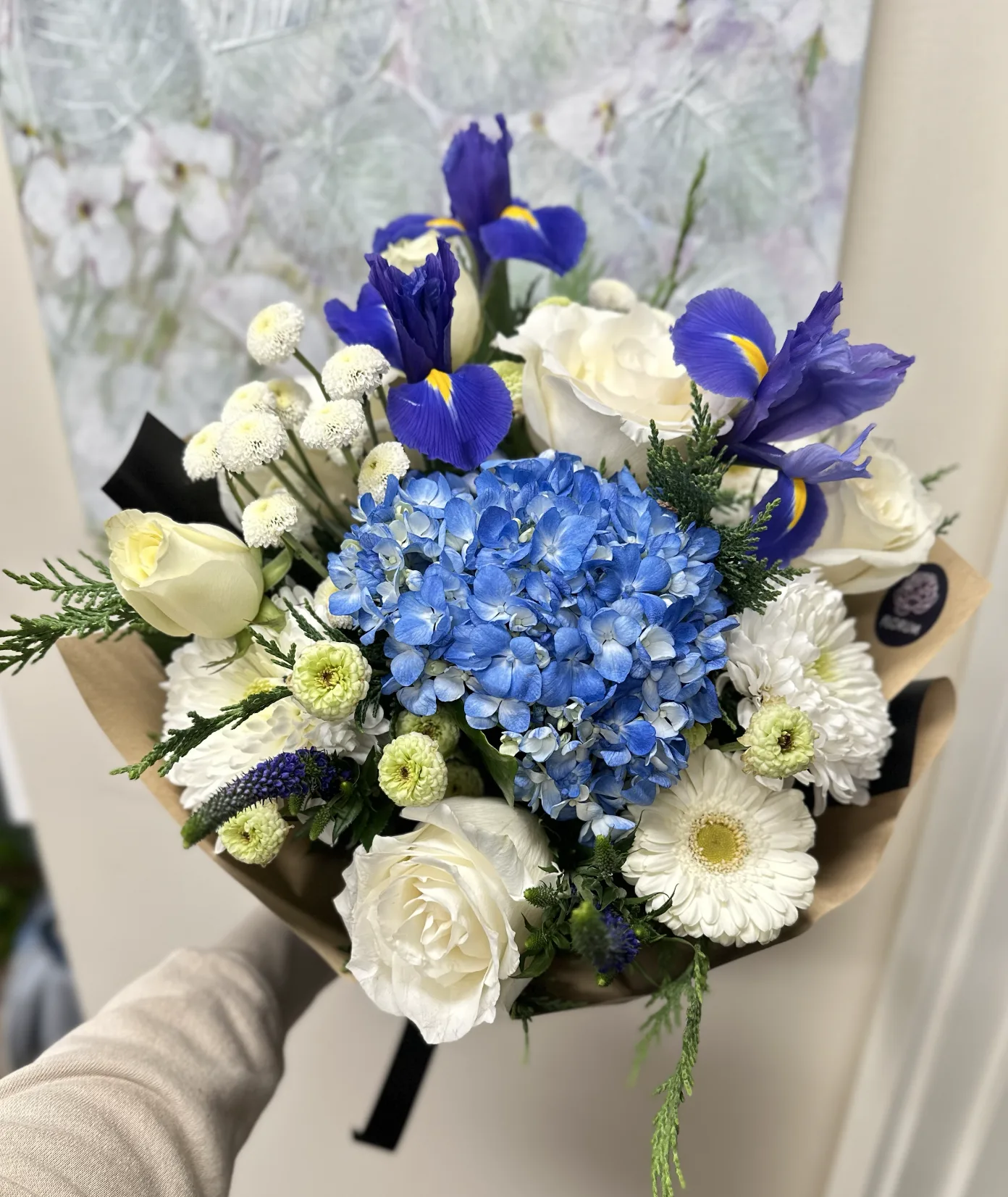 Sapphire is a breathtaking blend of blue hydrangeas, crisp white roses, delicate irises, and soft gerbera daisies, evoking the serene beauty of the ocean and sky. Accented with button mums, veronica, and lush greenery, this arrangement radiates elegance and tranquility, making it perfect for any special occasion or heartfelt gesture.