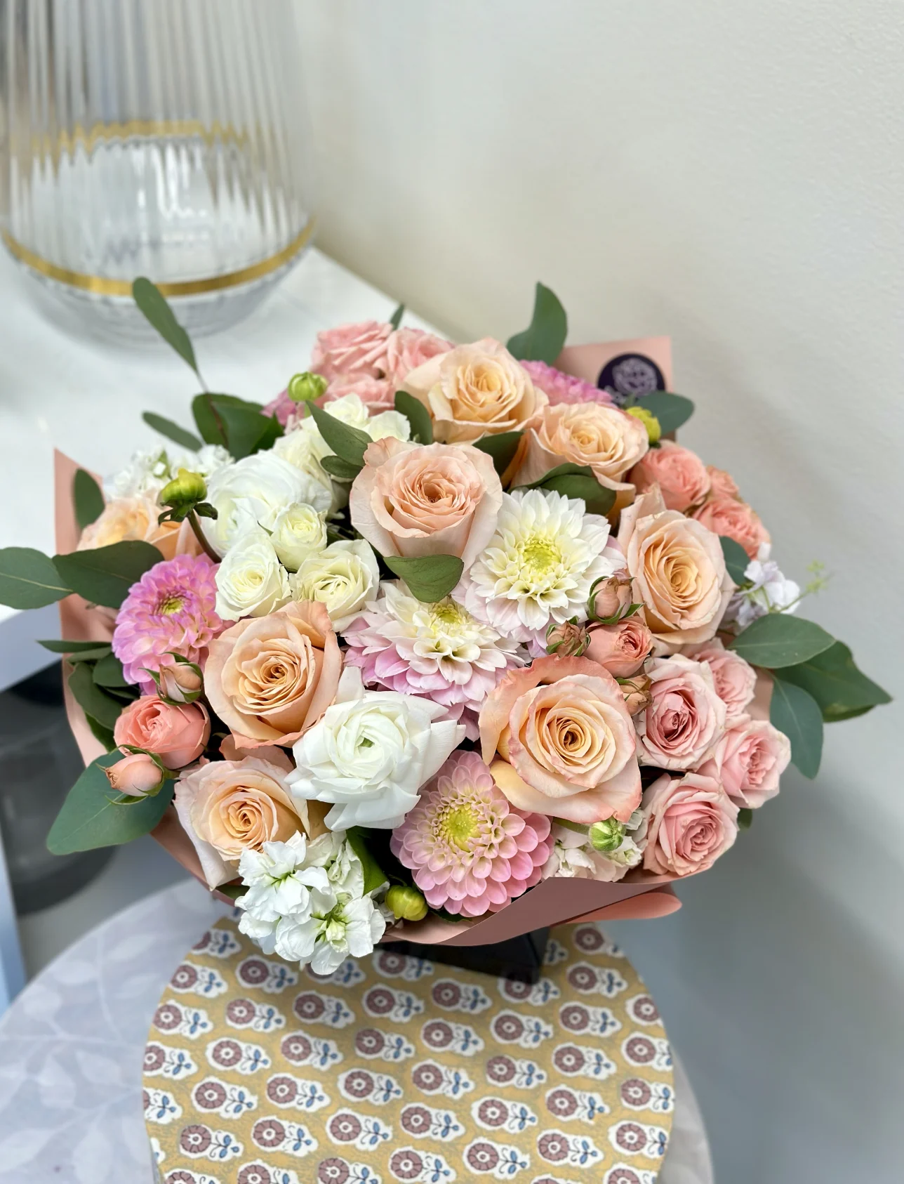 The "Tranquil Vibes" bouquet is a serene and soothing floral arrangement that embodies elegance and calm. This bouquet is artfully composed of delicate peach roses and soft white chrysanthemums, each bloom carefully selected for its soft hues and gentle beauty. The peach roses convey warmth and gratitude, their subtle color blending harmoniously with the pure, crisp white of the chrysanthemums, which add a touch of refined grace. This combination of roses and chrysanthemums creates a balanced and peaceful aesthetic, making the bouquet ideal for occasions that call for a soothing presence, such as sympathetic gestures, get-well wishes, or serene home decor. "Tranquil Vibes" is not just a bouquet; it is a heartfelt expression of care and serene beauty, designed to bring a peaceful ambiance to any space.