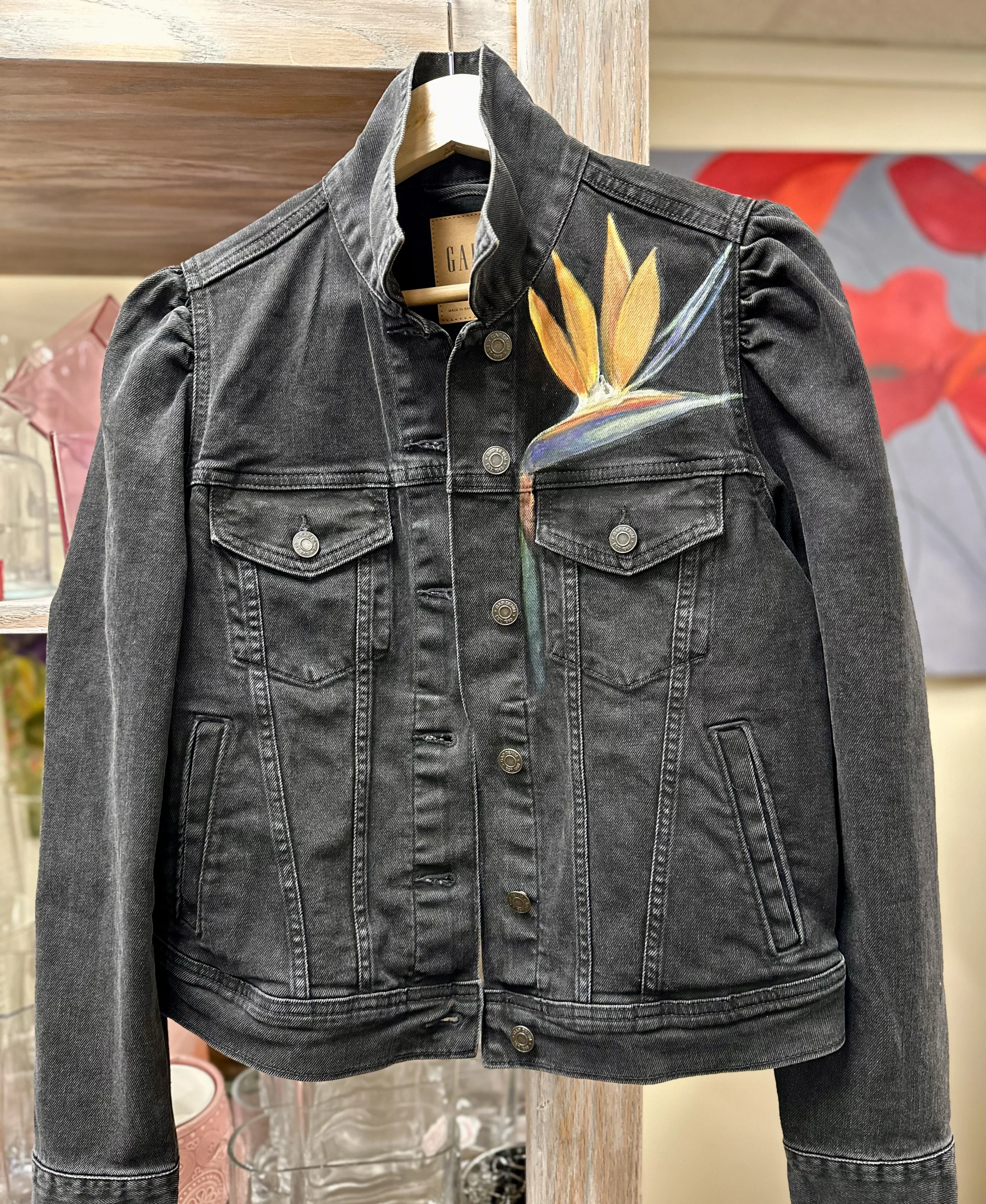 Elevate your street style with our Painted Denim Jacket adorned with stunning Strelitzia motifs. Crafted with care and attention to detail, this unique jacket features hand-painted Strelitzias, also known as Bird of Paradise flowers, delicately arranged to create a striking and eye-catching design. Each jacket is a one-of-a-kind piece, meticulously painted by skilled artisans, ensuring that you stand out from the crowd with your own individual style statement. Made from high-quality denim, this jacket offers both durability and comfort, making it the perfect addition to your wardrobe for any season. Whether paired with jeans for a casual look or layered over a dress for a more chic ensemble, our Painted Denim Jacket with Strelitzias is sure to add a touch of artistic flair to any outfit.