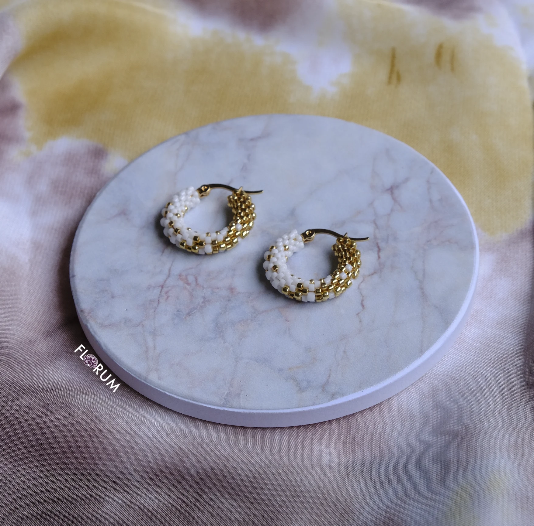 White and Gold Gradient Transition Beaded Hoop Earrings